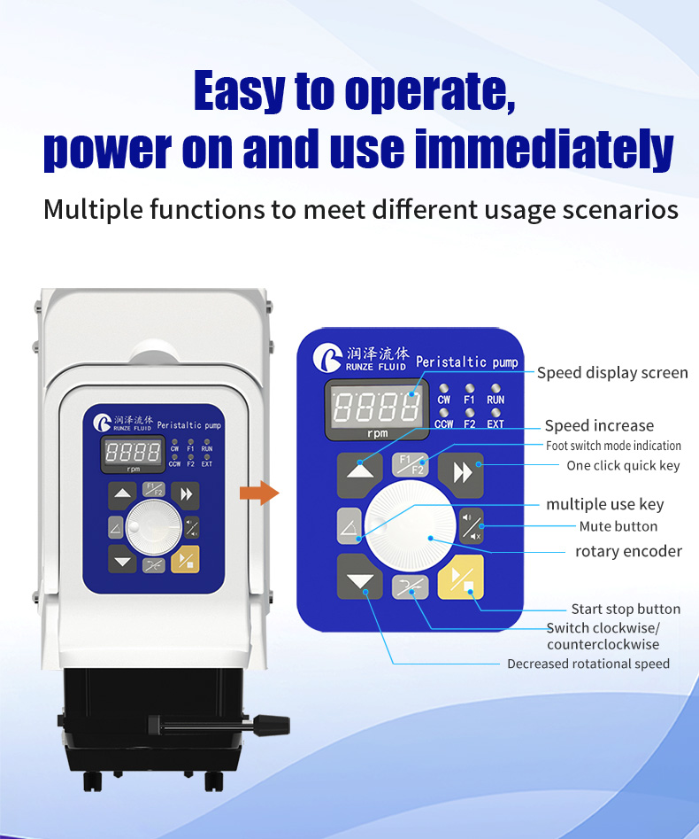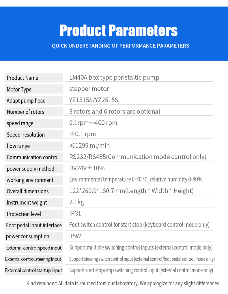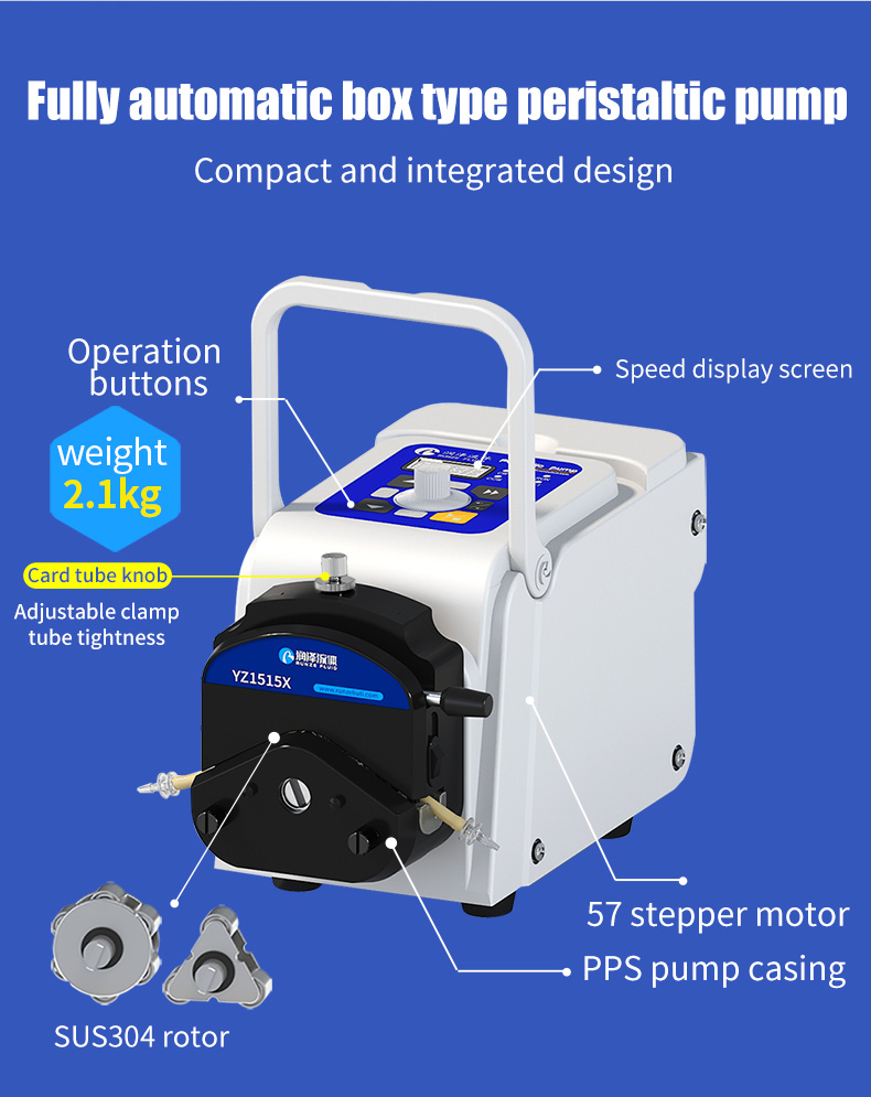 LM40 micro peristaltic pump is a stepper peristaltic pump driven by high precision stepper motor with adjustable speed and flow rate via speed button or rotary encoder, LCD screen display the current working speed to help users flexibly adjust the speed whenever needed, liquid direction can also be adjusted from CW to CCW or from CCW to CW.