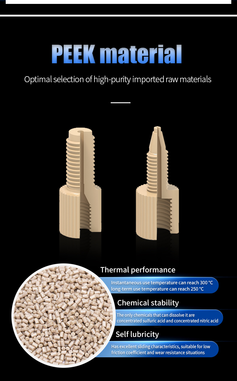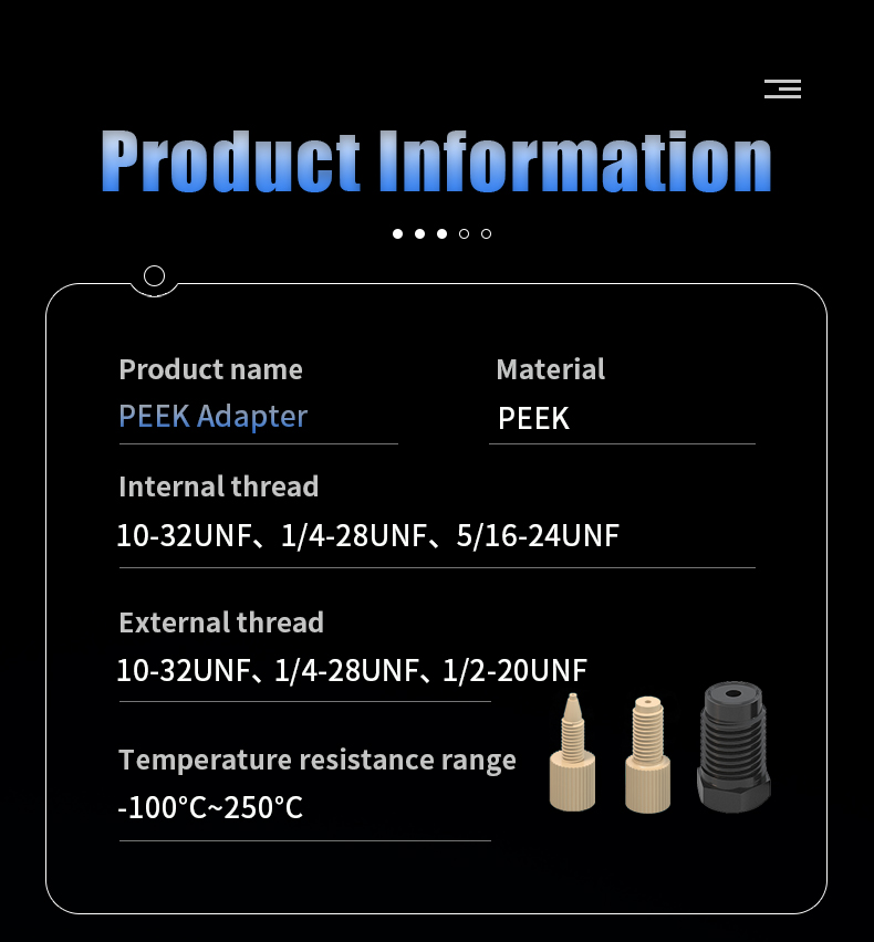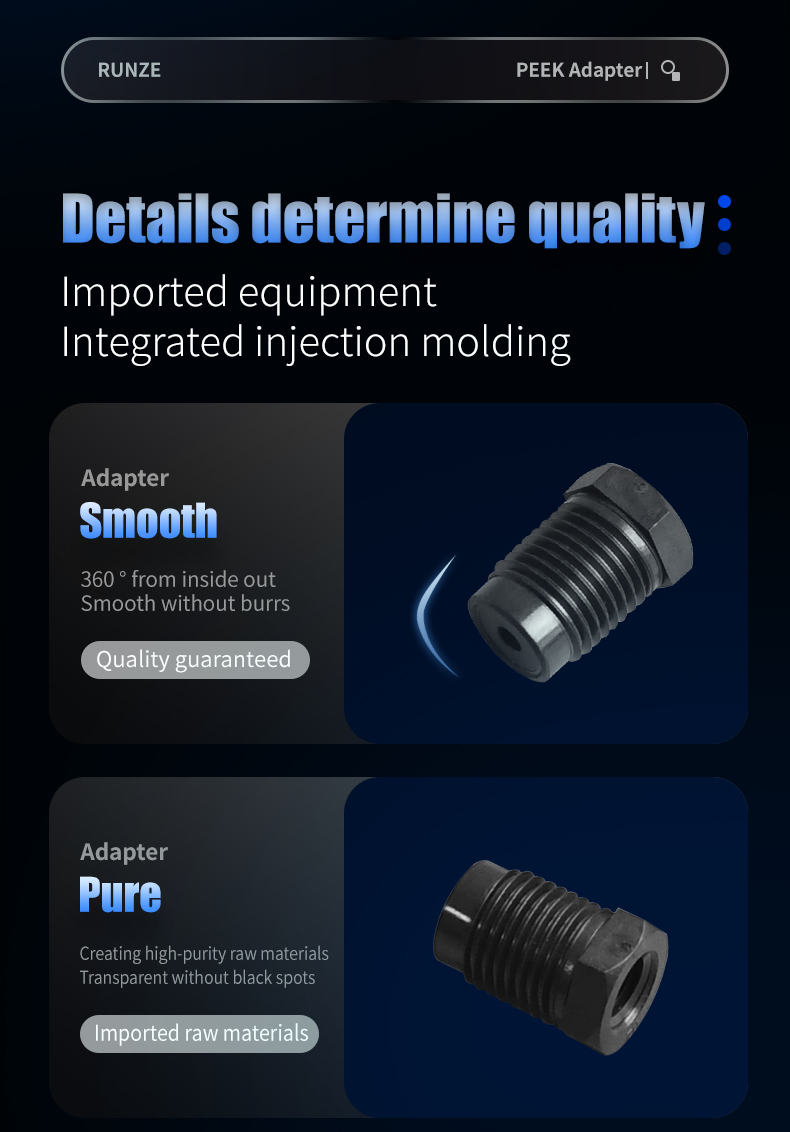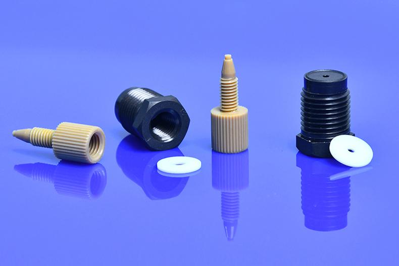 PEEK Adapter, using imported PEEK raw materials, is a specialized fitting for pharmaceutical pre-treatment equipment, achieving the connection between rigid pipes and equipment.