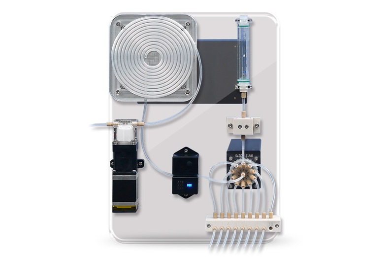 The PS-10 system consists of the following parts: SV-08 multi-port switching valve, RP-01 piston pump with solenoid valve and encoder, 5 ml flow path plate (liquid reservoir ring), solenoid valve, liquid level detector (optional) and digestion container (user-configured), the green part is the tubing.
